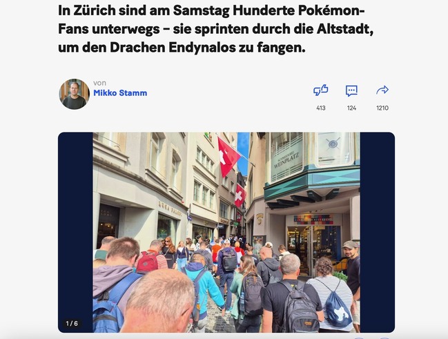 チューリッヒの街が、ポケモンGOのファンでいっぱいになりました。土曜日のチューリッヒの旧市街では、ポケモンファン達が街を駆け抜け、ドラゴンを捕···